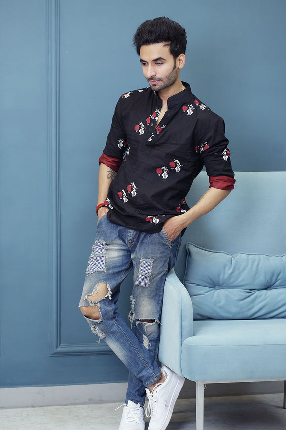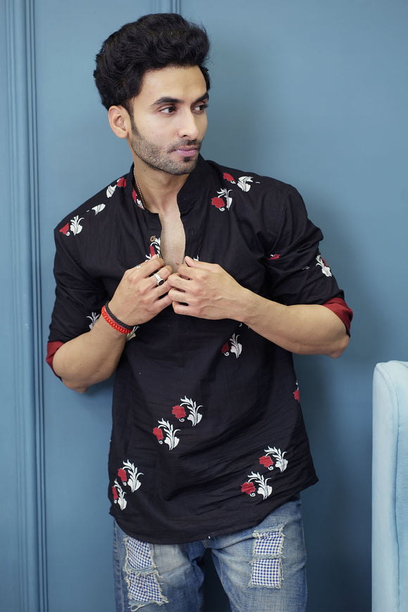 Black Red Flower Cotton Trendy Short Kurta | Style Matters