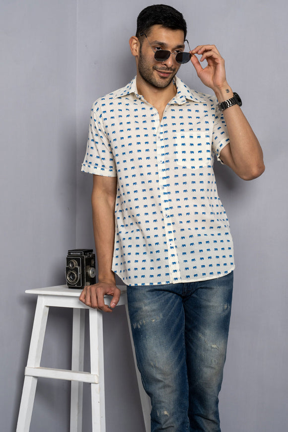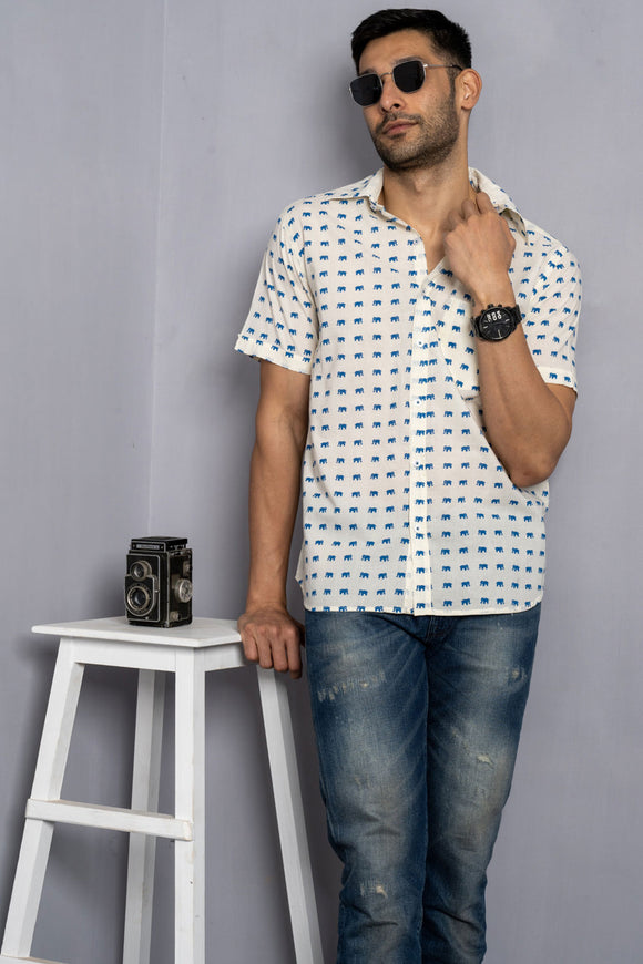 Cream Shirt with Blue Elephant Print Half Sleeves | Style Matters