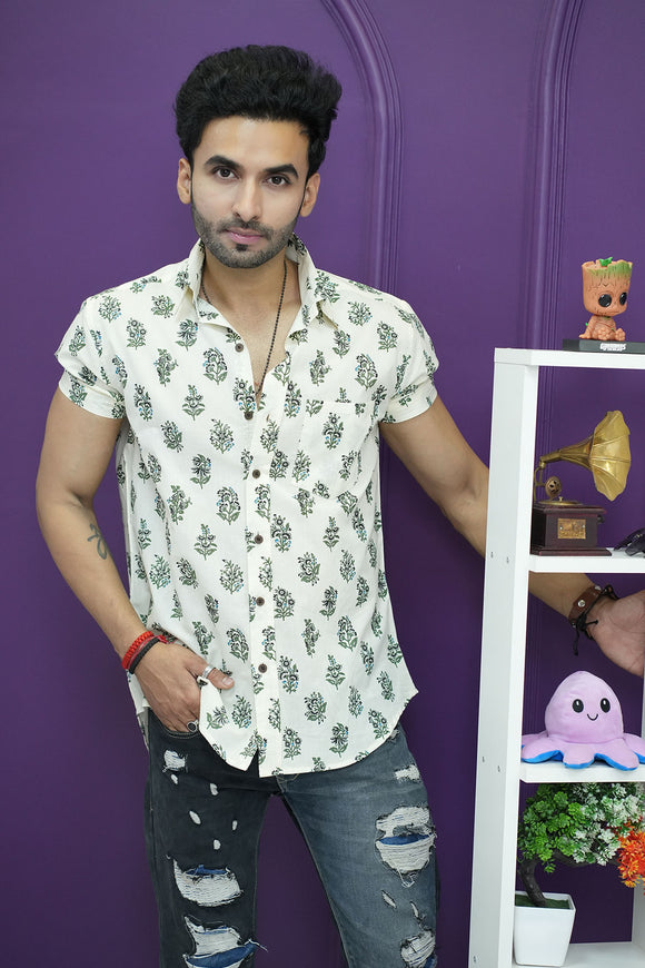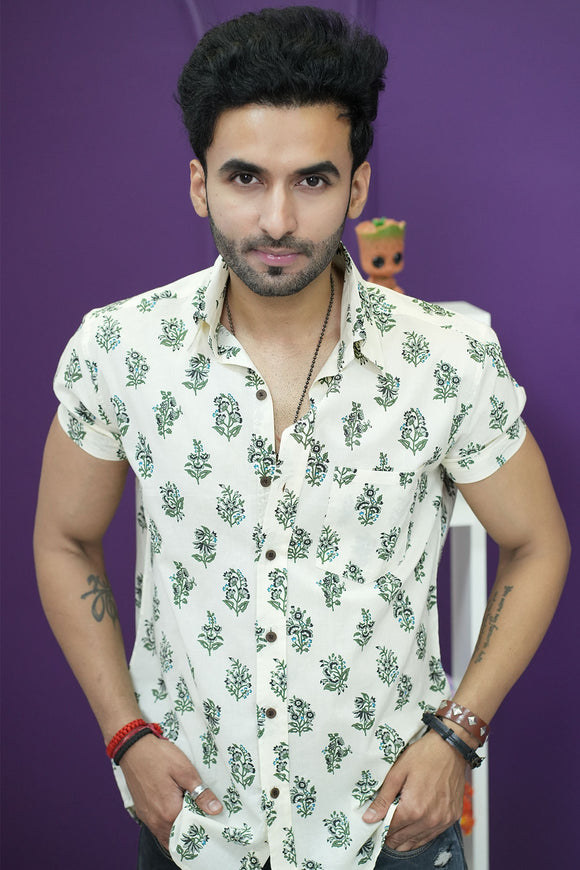 Cream Shirt with Green Flower Print Half Sleeves | Style Matters
