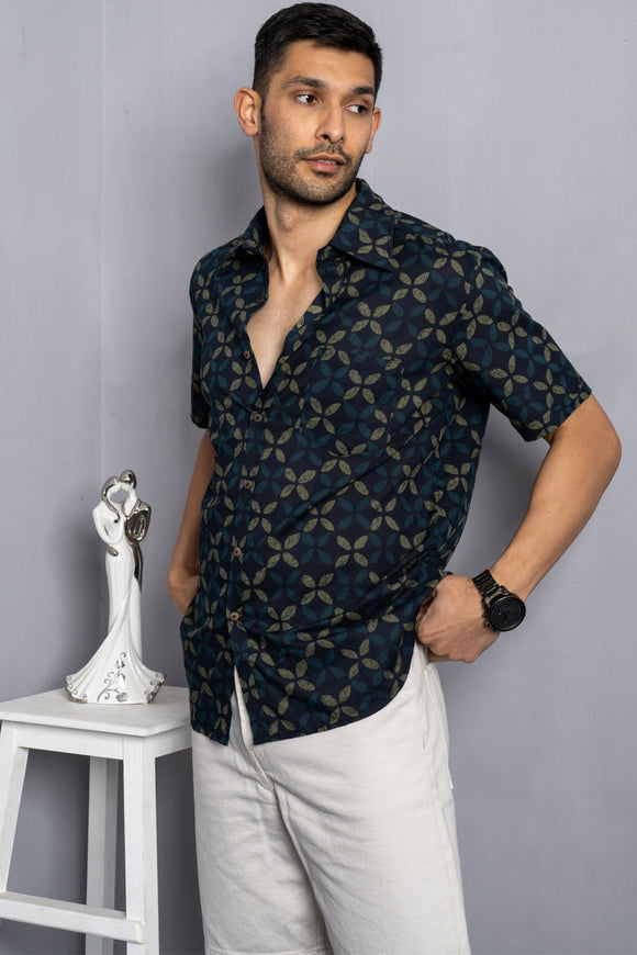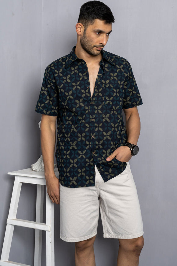 Dabu Indigo Flower Handblock Print Cotton Shirt, Half Sleeves | Style Matters