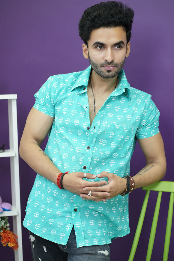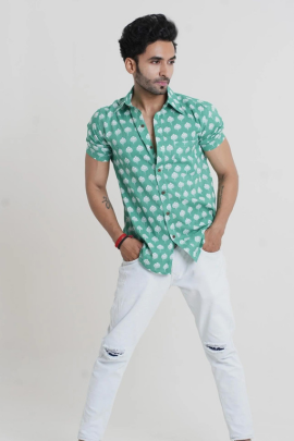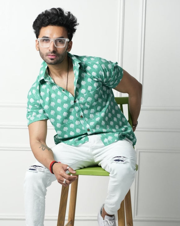 Green Shirt with Lotus Print, Half Sleeves | Style Matters