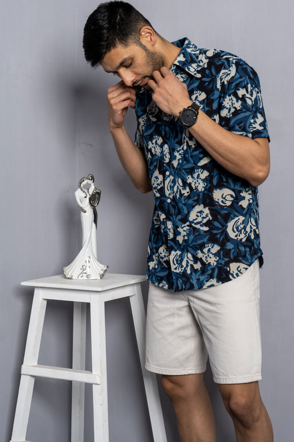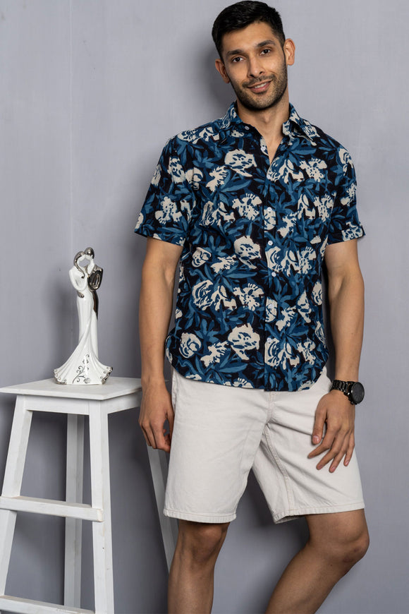 Dabu Indigo Flower Handblock Print Cotton Shirt, Half Sleeves | Style Matters