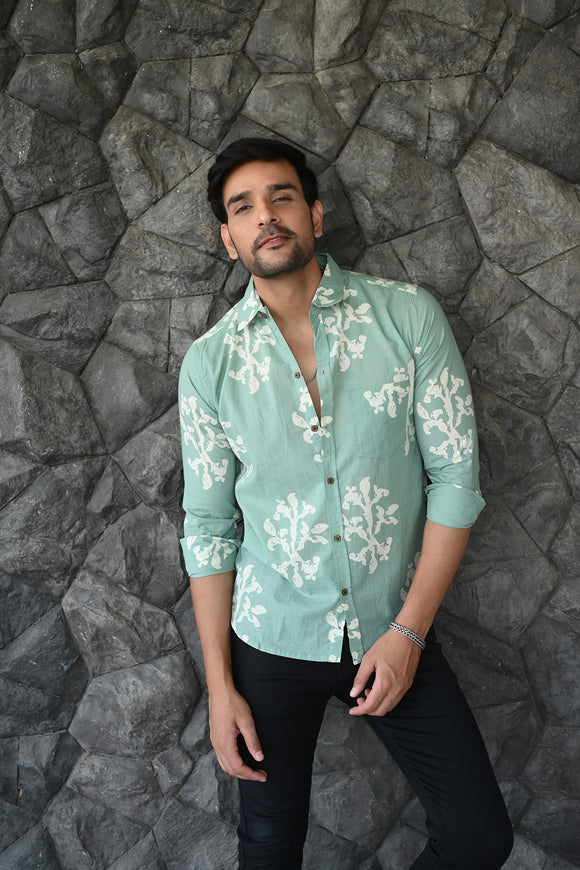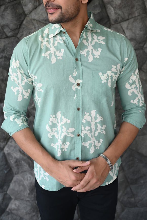 Green Shirt with White Motif Print, Full Sleeves | Style Matters