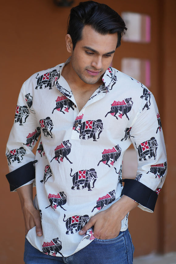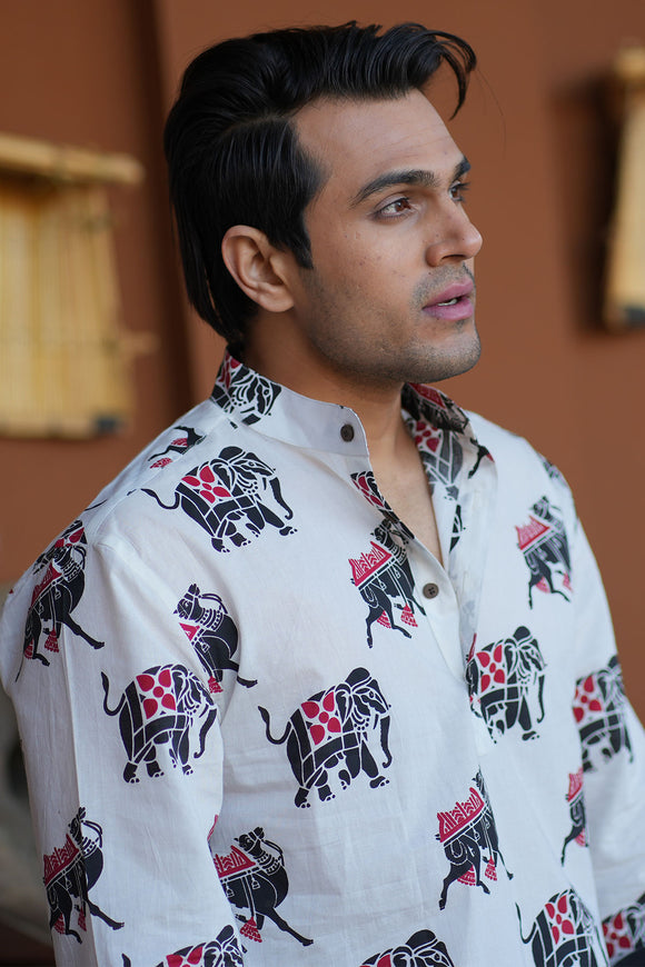 White Traditional Short Kurta with Camel Elephant Print | Style Matters