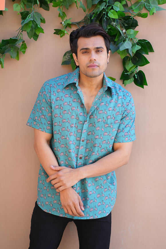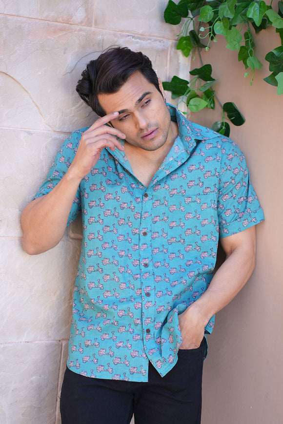 Blue Scooter Print Cotton Shirt, Half Sleeves | Style Matters